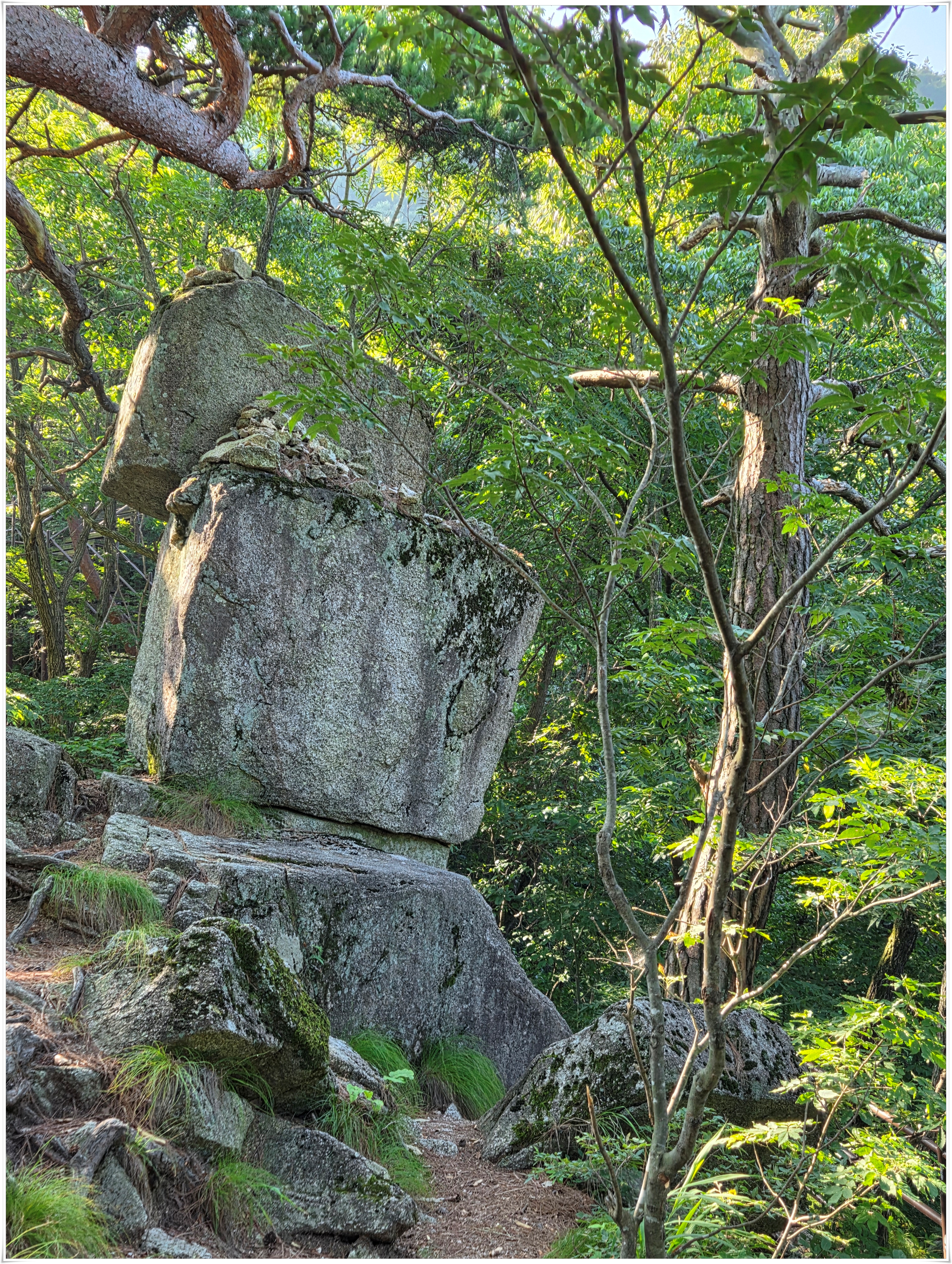 ▲지주대-구룡계곡 9곡중 6곡 둘레의 기암 절벽이 마치 하늘을 떠받치듯 구름다리 앞에 자그마한 봉우리가 솟아 있어 지주대라함