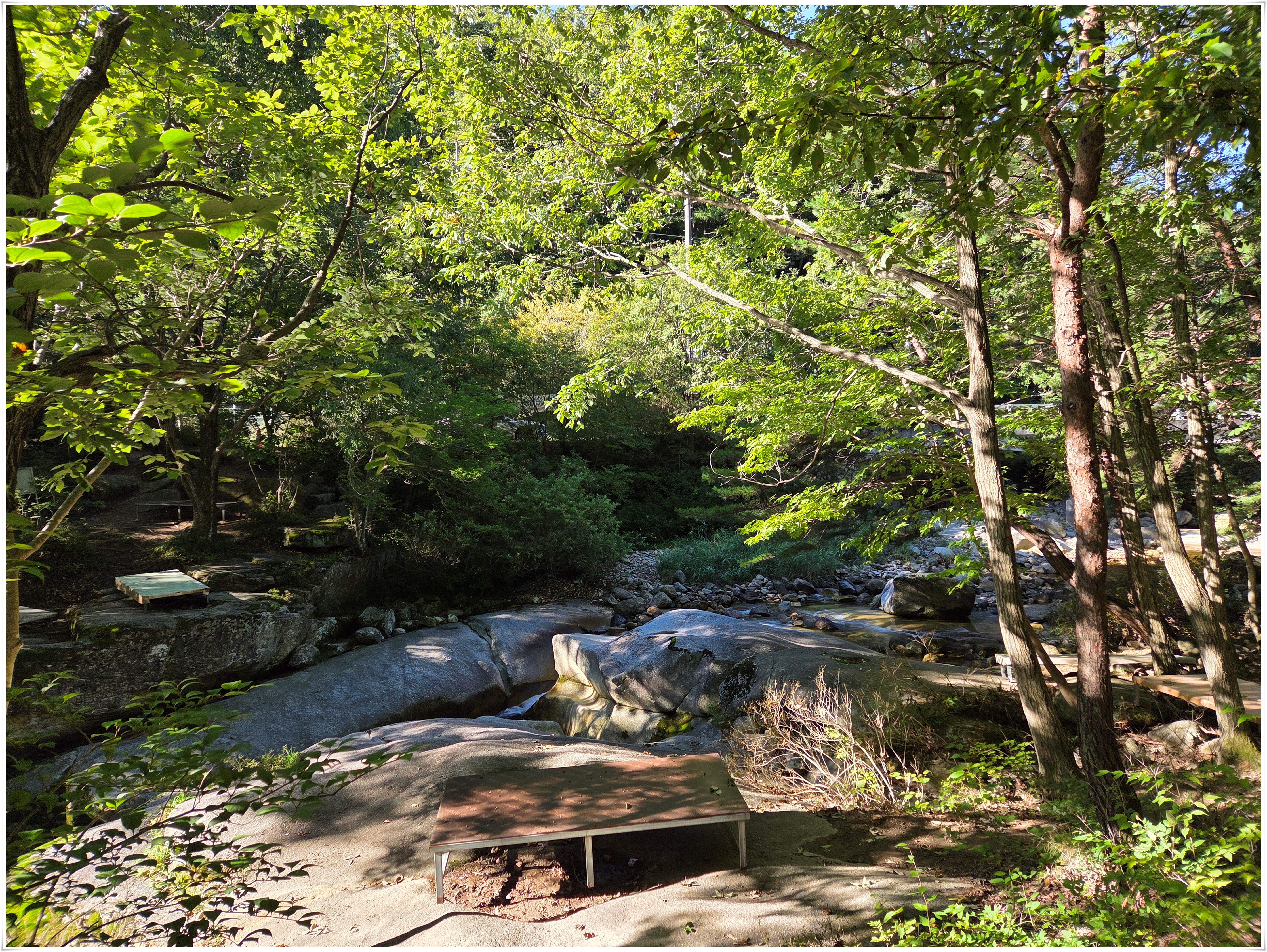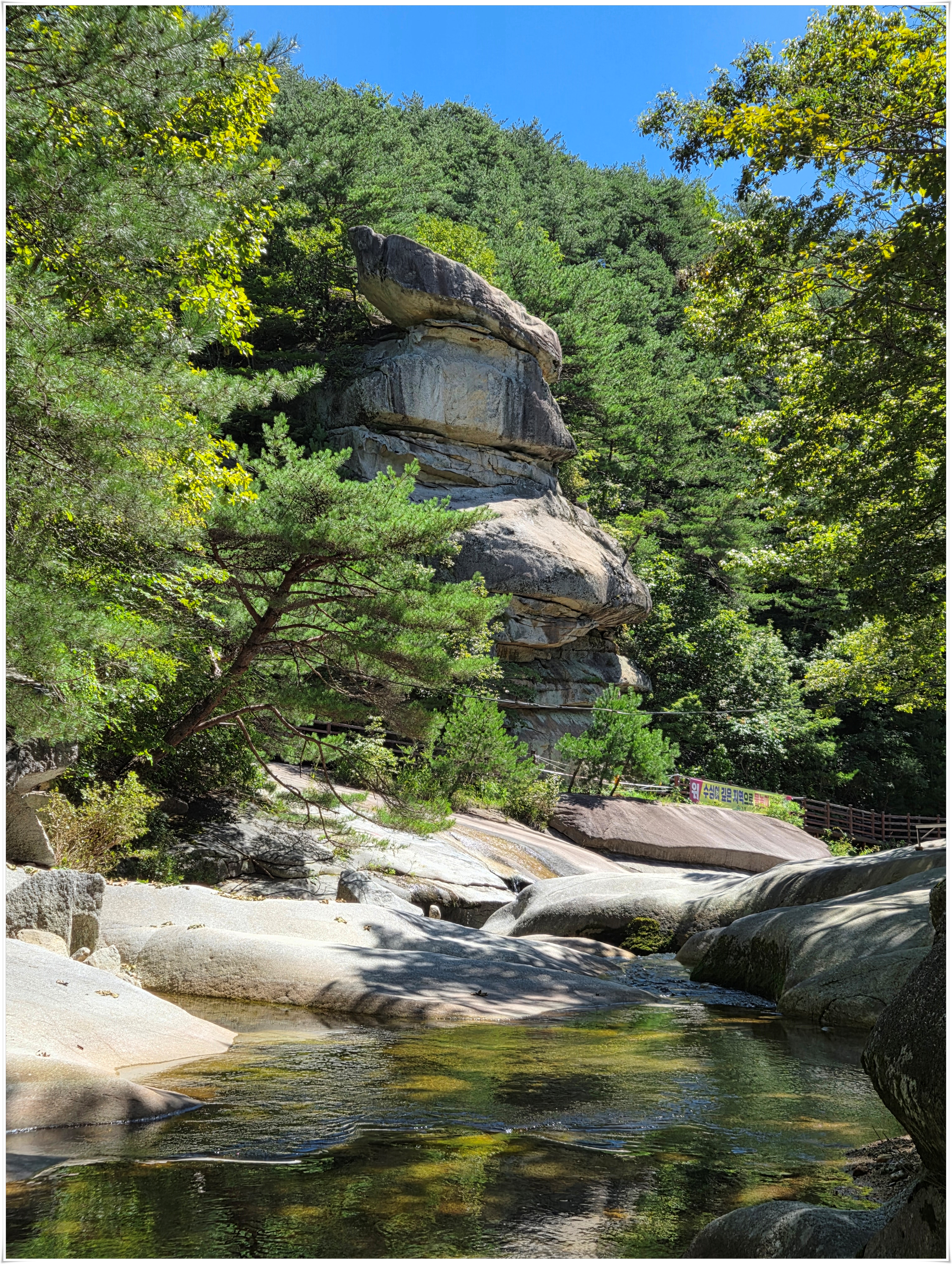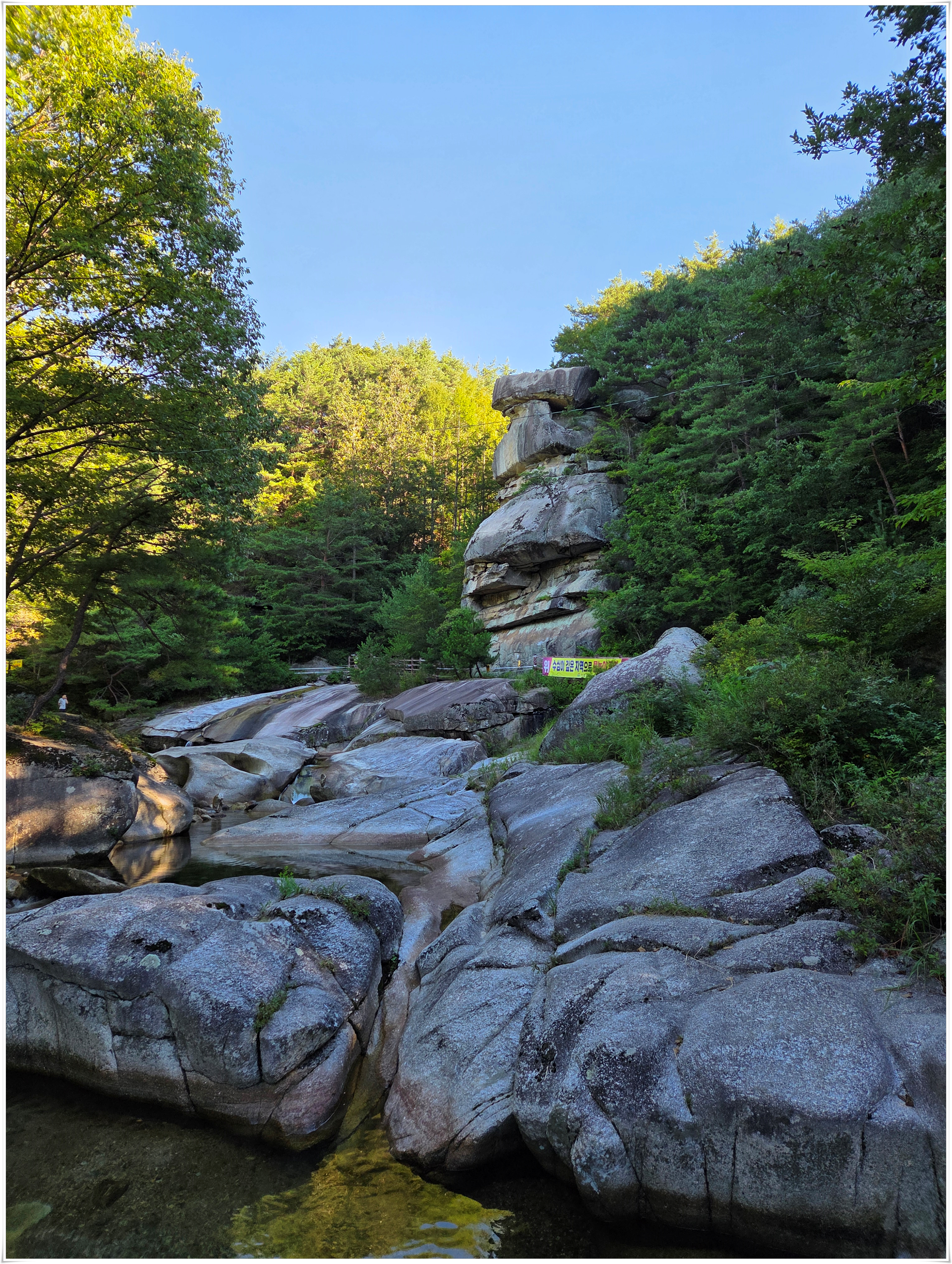 ▲사선대 이곳에서 물놀이 하였음, 서출동류물길트레킹코스에서 물놀이 하기 좋은 곳은 사유지라고 적혀 있고 하루 평상대여료을 50,000원을 받는 다고 한다. 이날은 대부분 오전에는 물놀이 하는 사람들이 없었고 오후에 보니 도로변에 많은 차들이 주차 되어 있었다. 여름철 마지막이라서 그런지 내가 물놀이한 사선대는 평상 대여료를 받는 사람이 안 보였다. 여름철 물놀이 하기 좋은 계곡에 불법적으로 평상을 만들어 대여료을 받아 문제가 많은데, 계곡은 국유지이고, 또 사유지라도 계곡은 공공재로 돈을 받을 수 없음에도 불법 관행이 고쳐지지 않고 계속되고 있다.