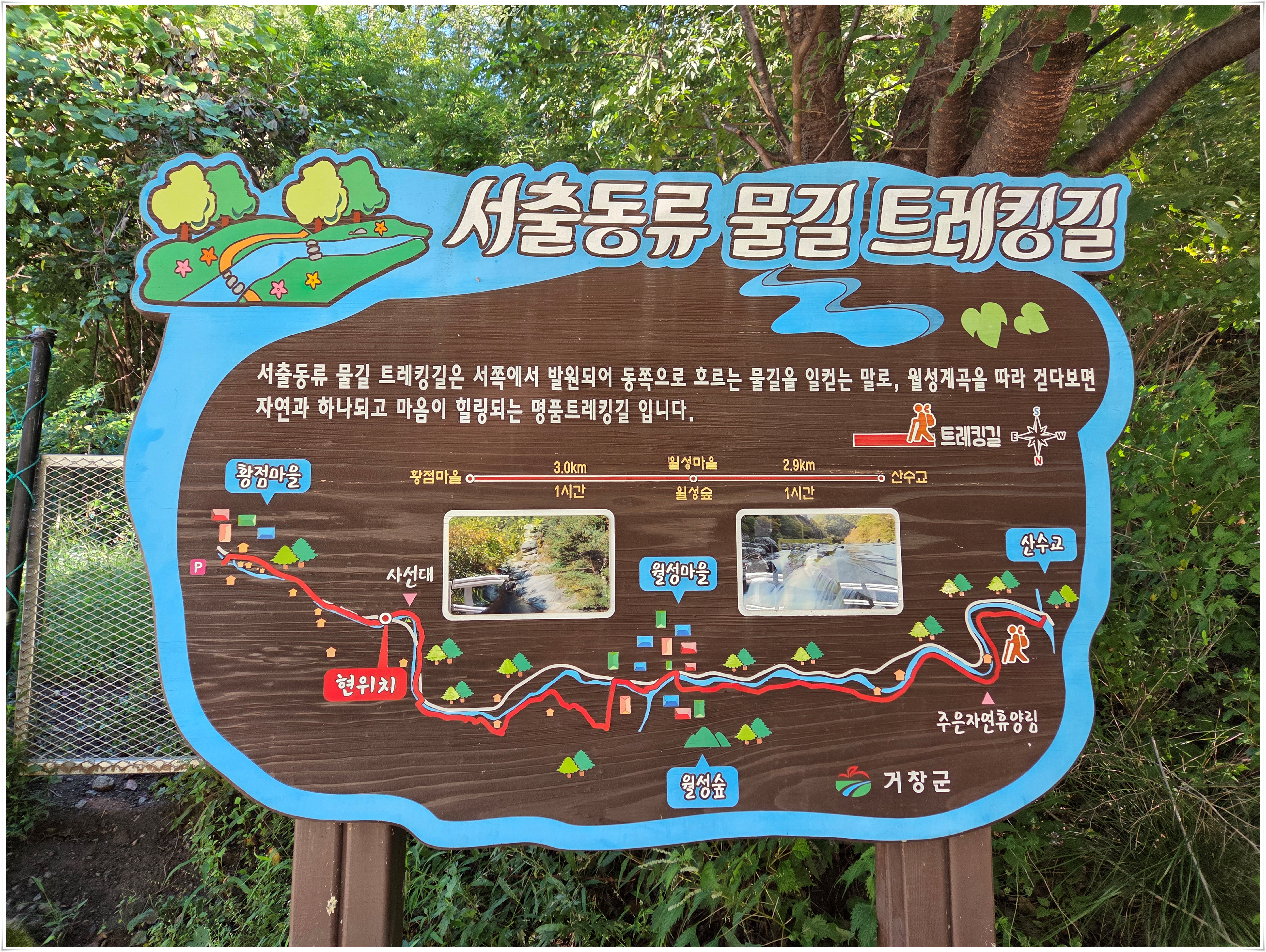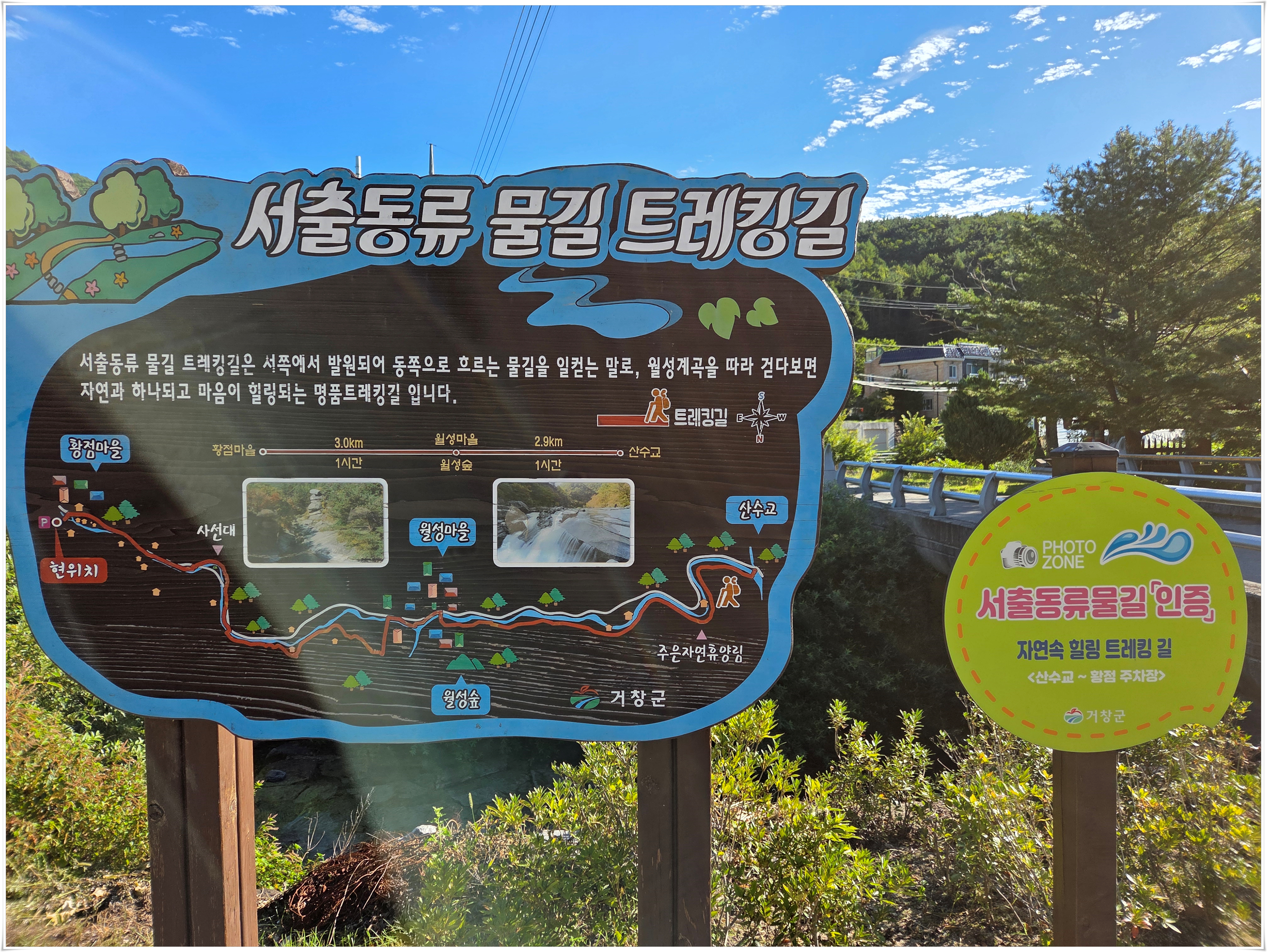 경남 거창 북상면 월성계곡 물길을 따라 걸을 수 있는 명품 도보 여행길 서출동류 물길 트레킹은 서쪽에서 발원되어 동쪽으로 흐르는 물길을 일컫는 말로 흐르는 월성계곡물이 맑고 깨끗하여 물길을 보고 즐기면서 걷다보면 자연과 하나가 되고 마음이 힐링되는 도보길 이다. 1구간은 산수교에서 월성숲까지, 2구간은 월성숲에서 황점마을 까지 총길이 5.9km로 2021년 전구간이 개통 됐다. 서출동류물길은 월성계곡을 따라 데크길, 야자매트길, 자연흙길, 마을길등 다양한 소재의 길을 걸을 수 있다. 황점마을에서 산수교 까지는 내리막길이 대부분 이어져 있어 산수교에서 황점마을로 오르는것 보다 수월 할 수 있다.