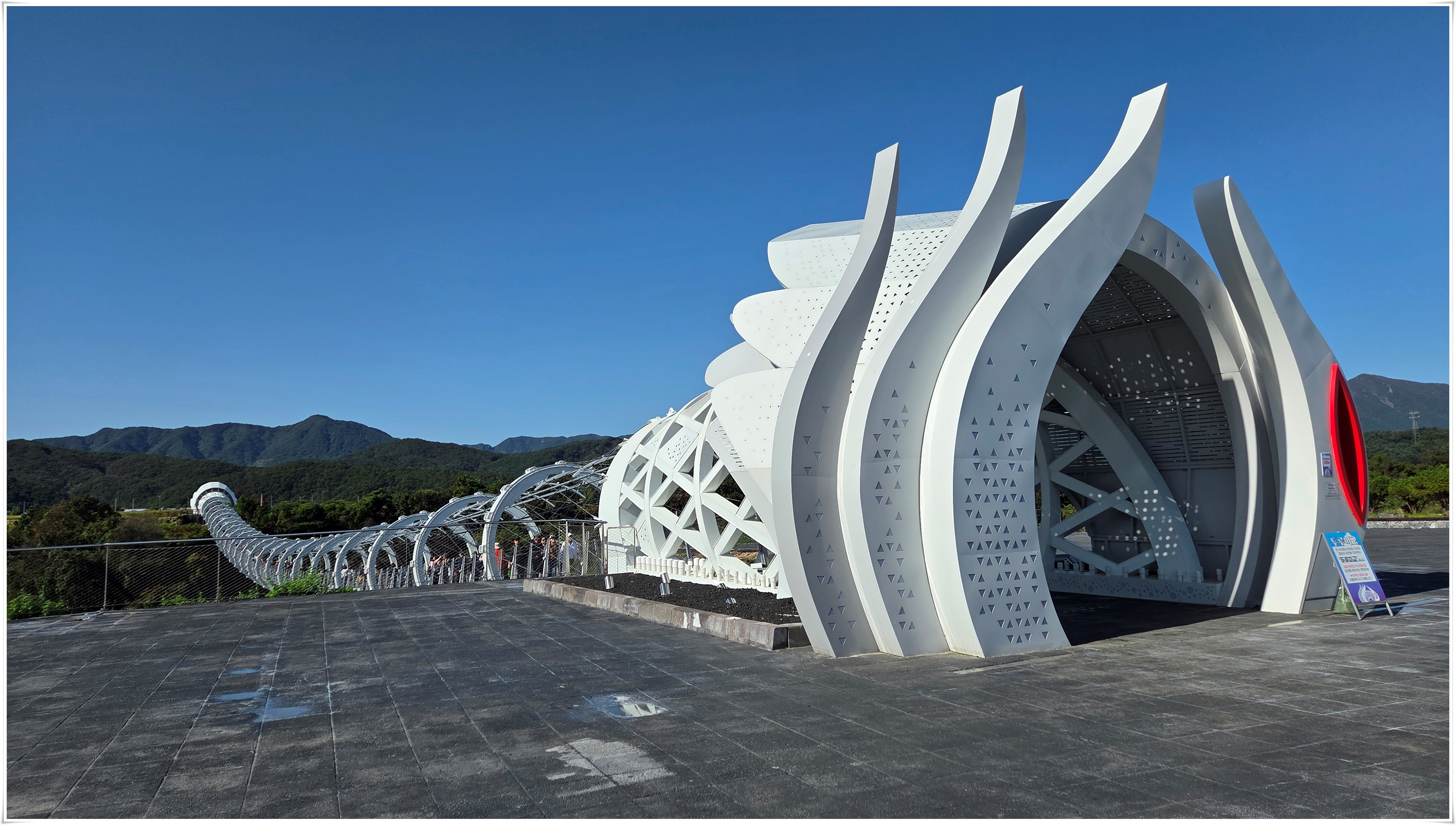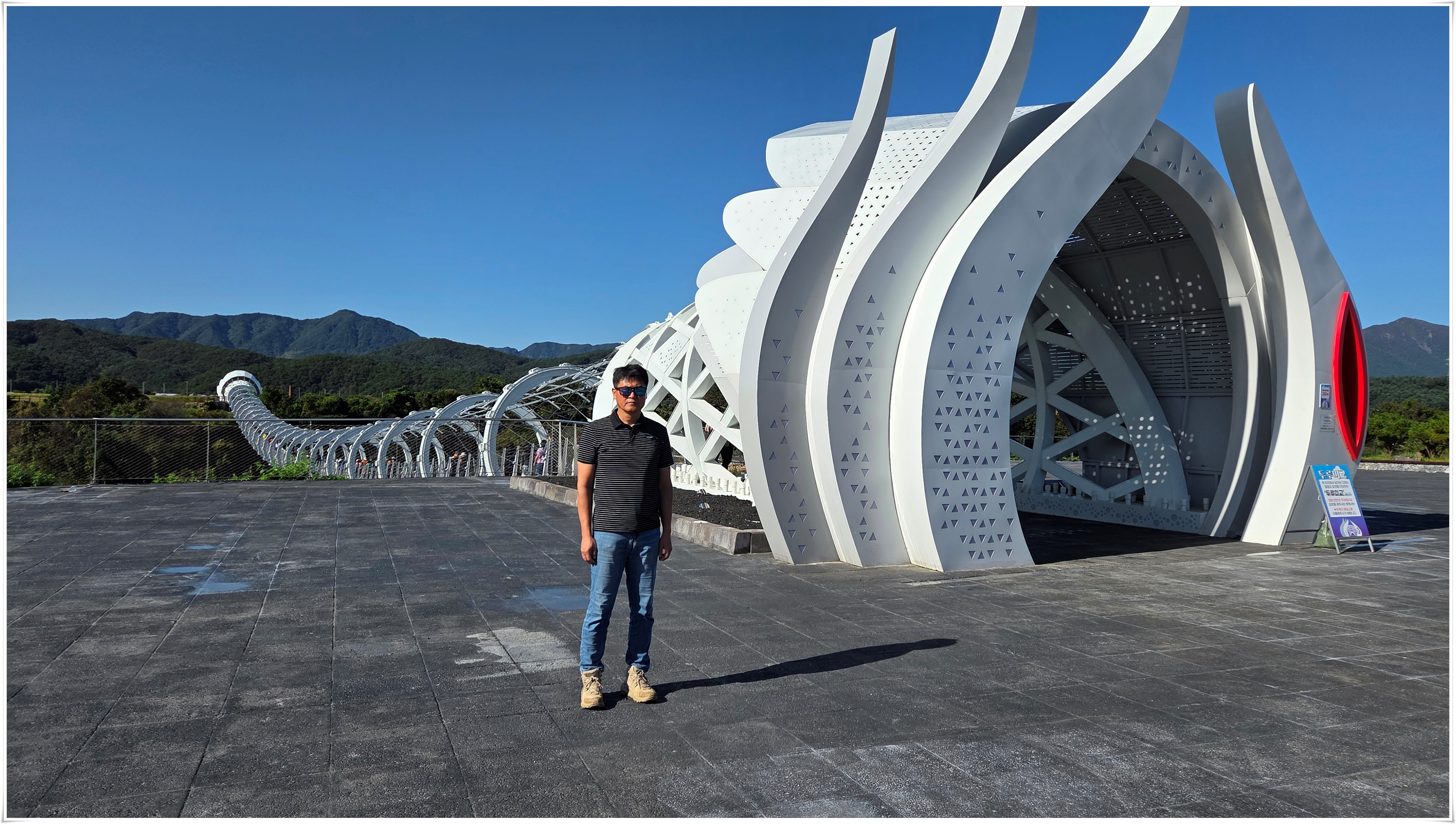 ▲철원한탄강 스카이 전망대-타원형 구조로 바닥이 유리로 되어 있다
