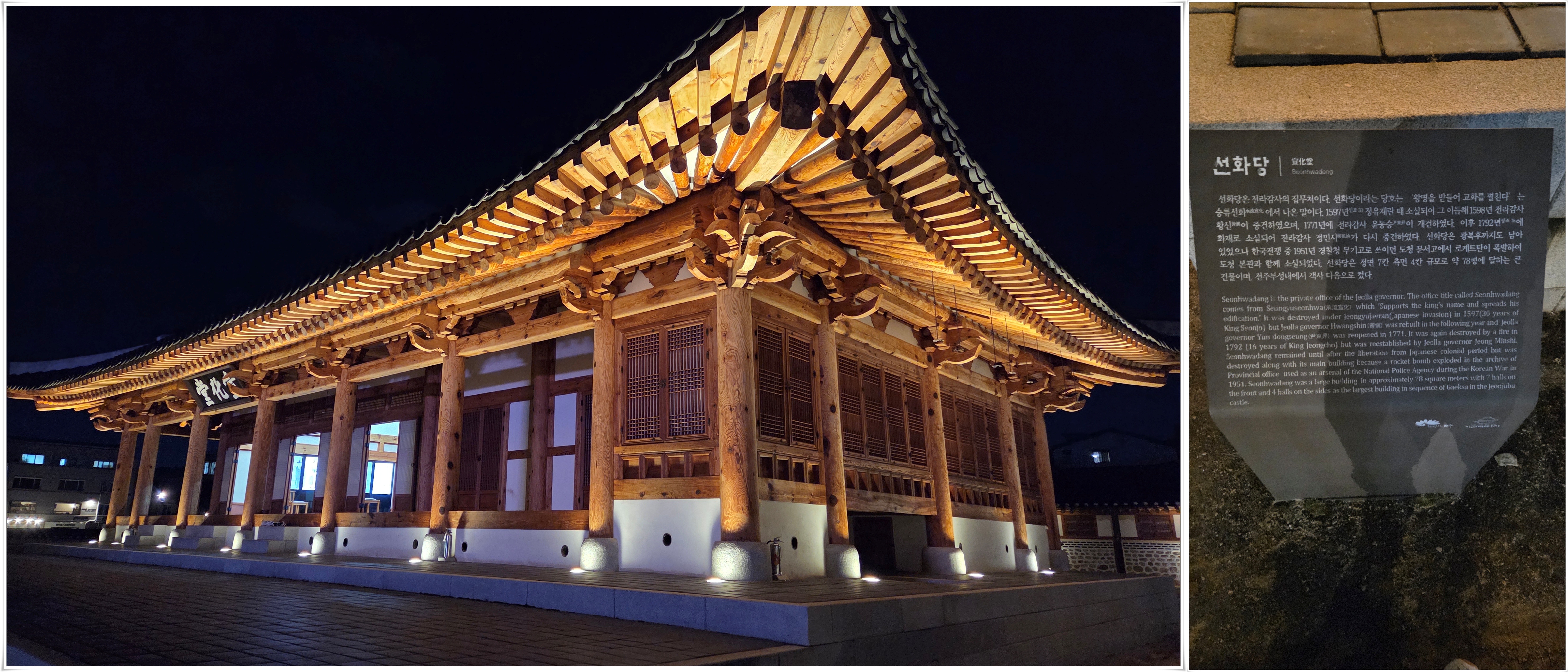 전라감영은 조선왕조 500년 동안 호남과 제주 56개 군현을 관할하던 관청이다. 호남 정치, 경제 문화 중심이자 통치 핵심으로 역할했다. 1951년 한국전쟁 당시 폭발사고로 불에타 없어졌다. 1952년 그 자리에 전북도청사가 들어섰다. 2005년 전북도청사가 신시가지로 옮겨가면서 전라감영 복원 논의가 본격화되었다. 2020년 동편 부지에 선화당, 연신당 등 핵심 건물 7개를 복원했다. 전주한옥마을 인근에 위치하고 있어며 조선의 숨결과 전통이 함께 하는 곳 전라감영에서 전주의 밤을 빛내는 역사 명소로 손꼽 힙니다.