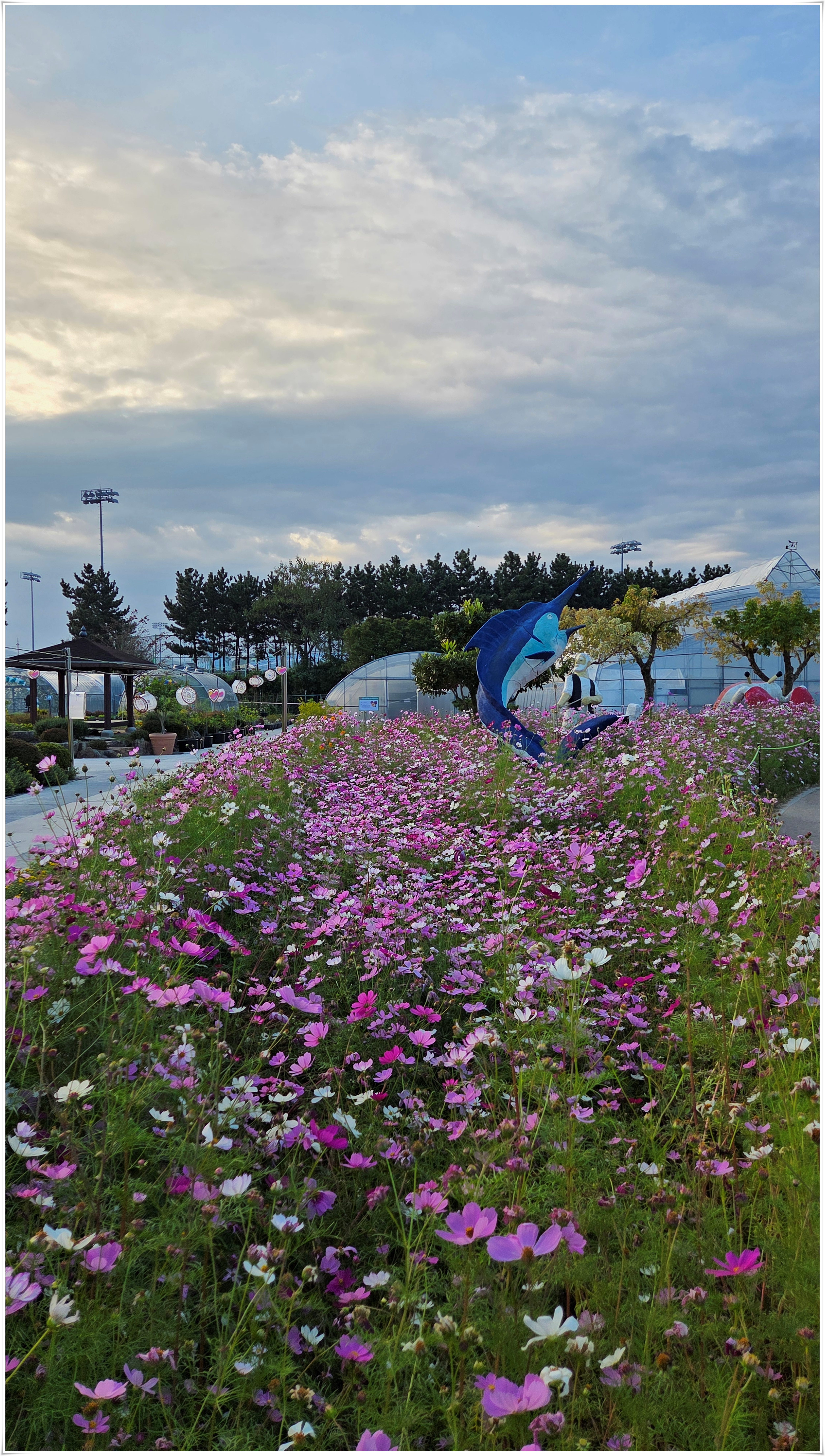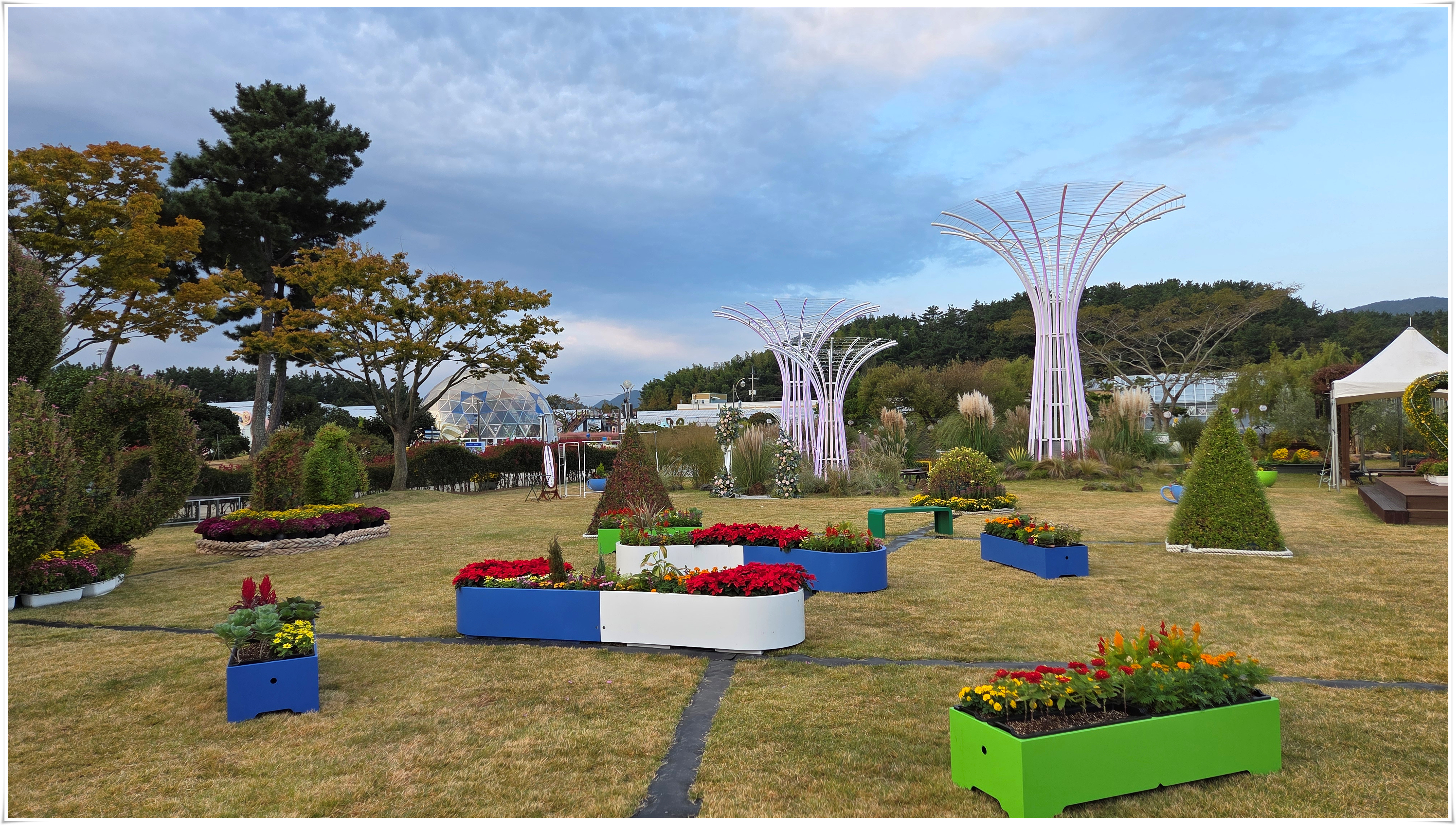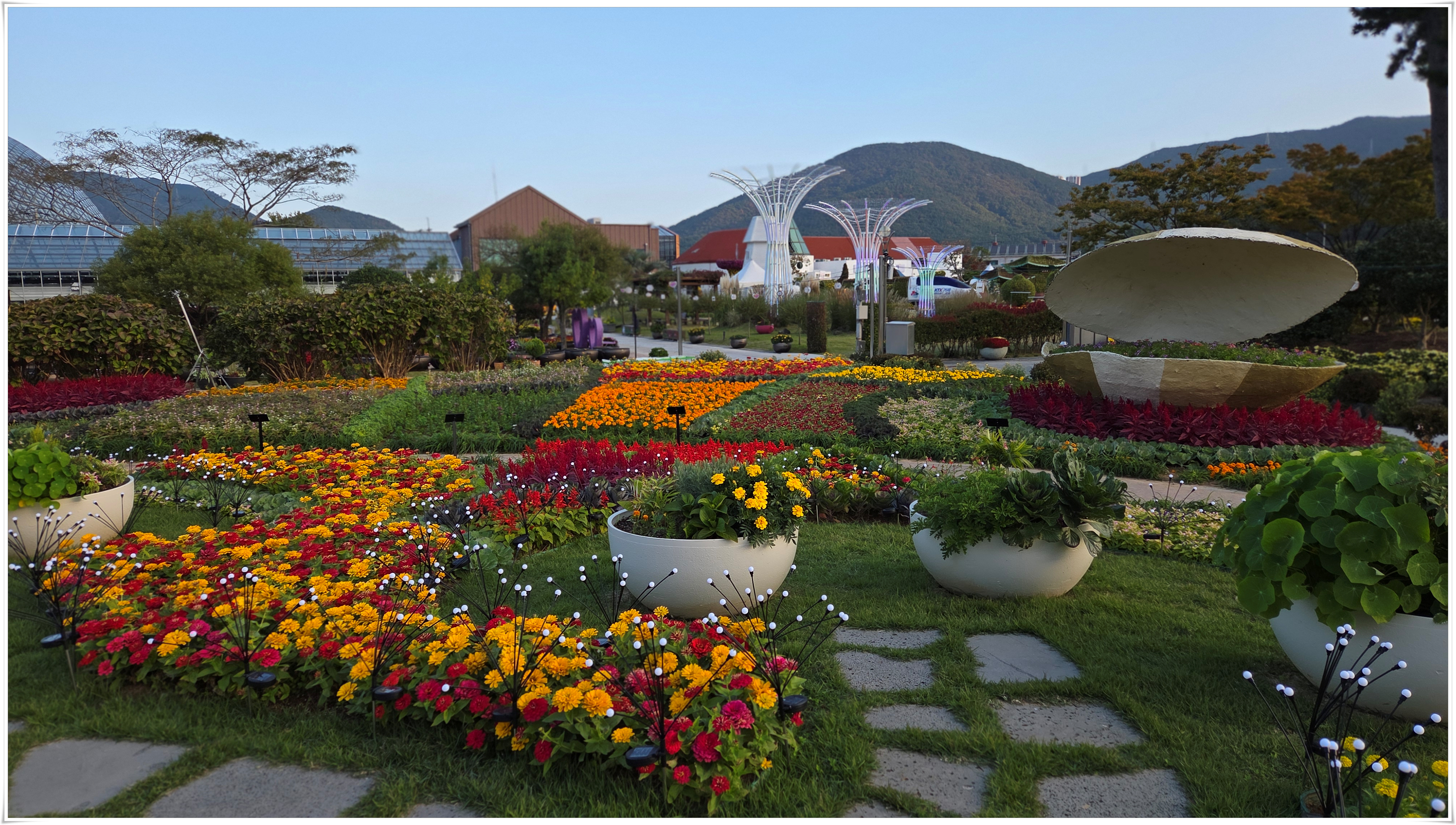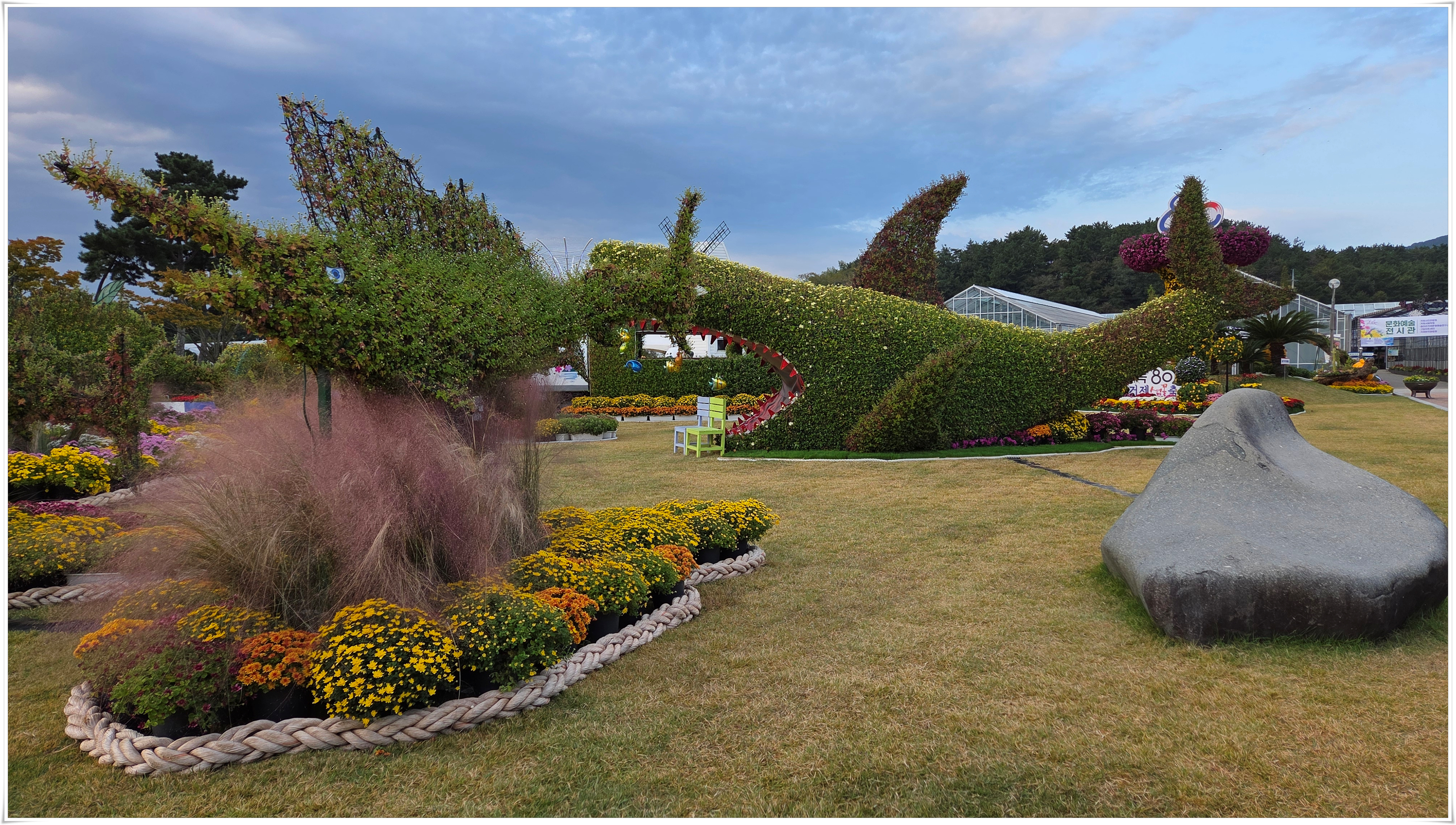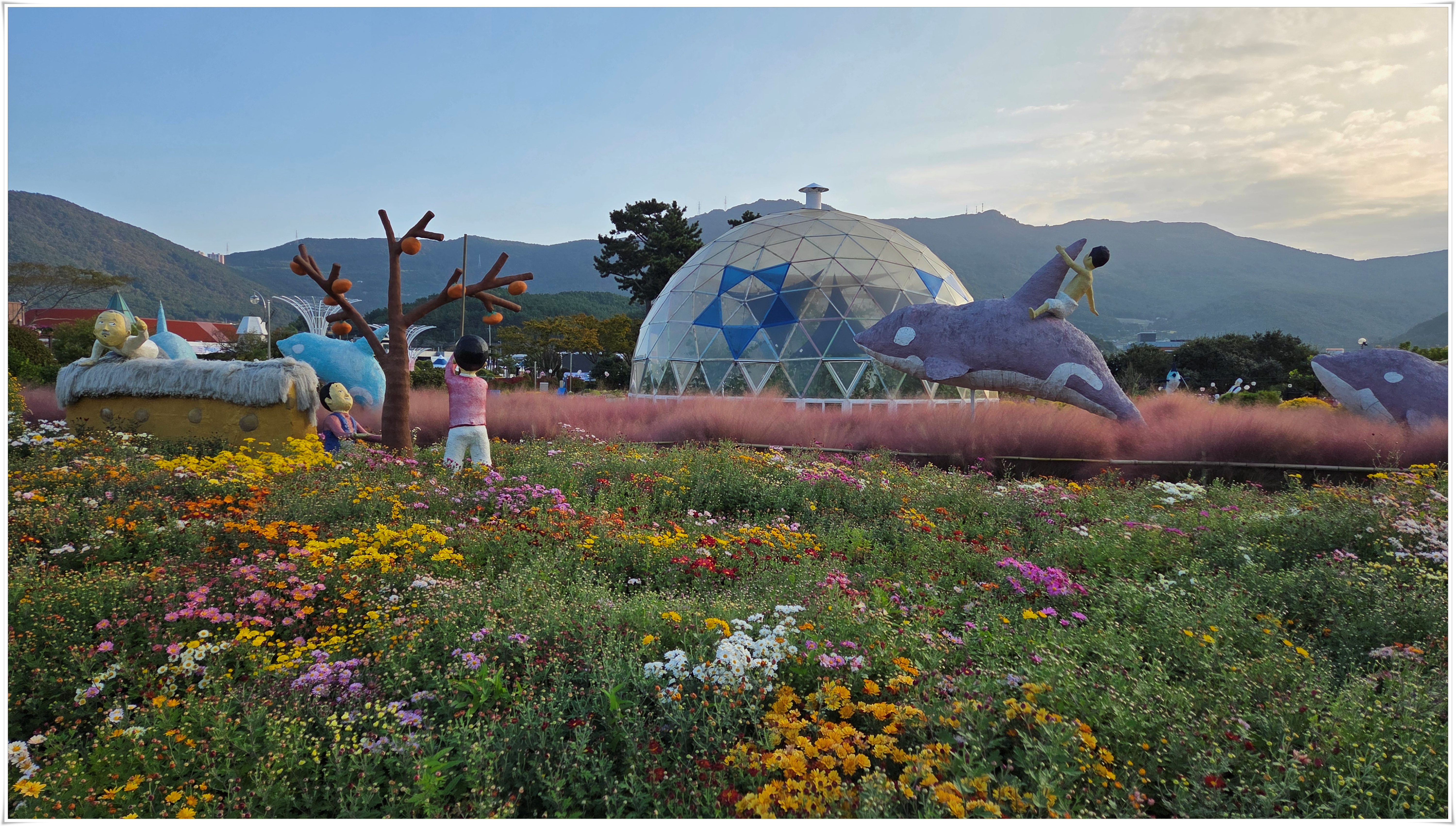 가을꽃 향연 국화와 코스모스 핑크물리등 가을을 물들이는 형형 색색의 꽃들로 축제장을 가득 채우고 있었다. 밤외 되면 조형물 위로 불빛이 내리고 프로젝션 맵핑이 만들어내는 환상적인 야경과 낮과는 전혀 다른 모습을 볼 수 있다고 한다.
