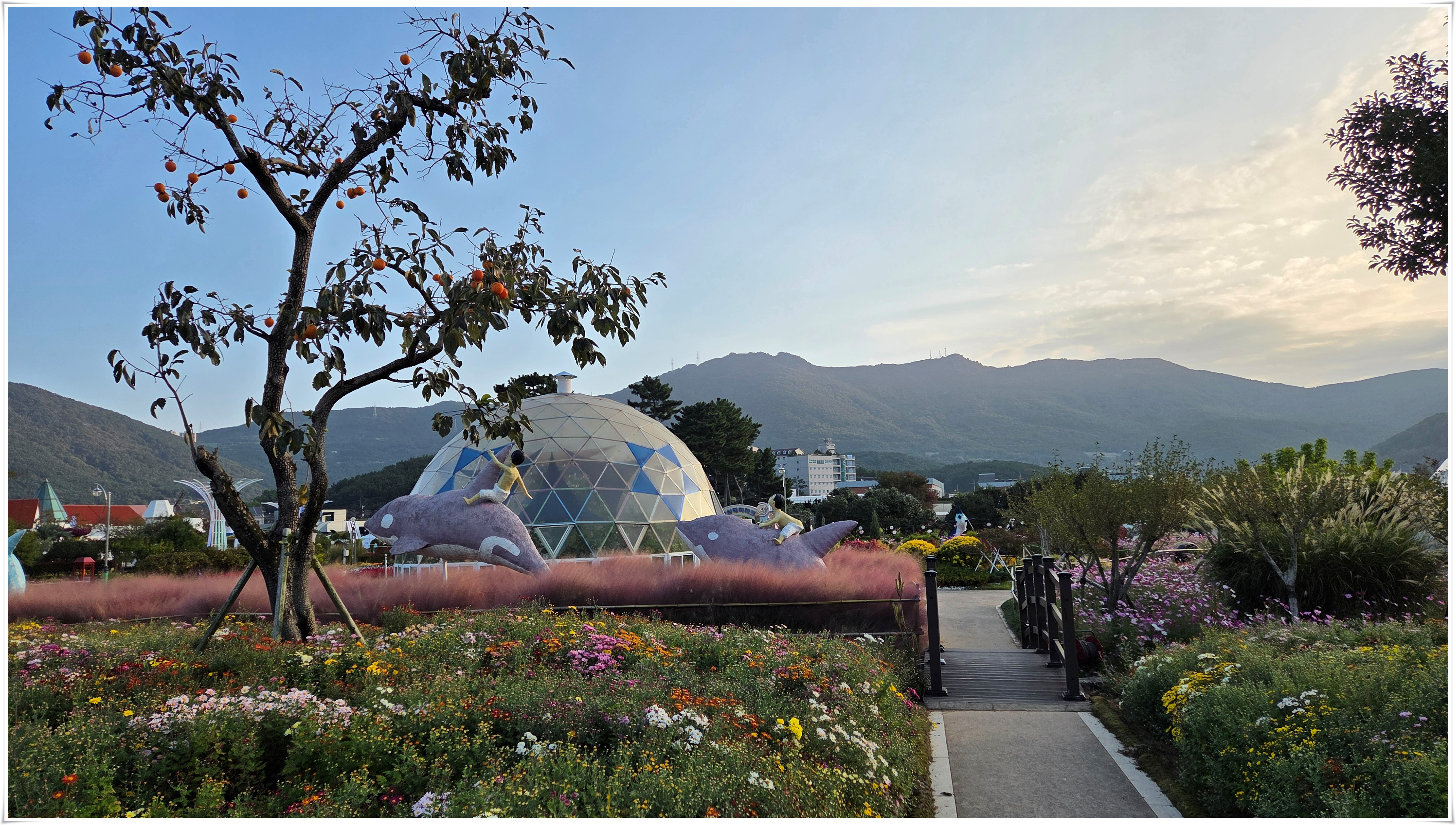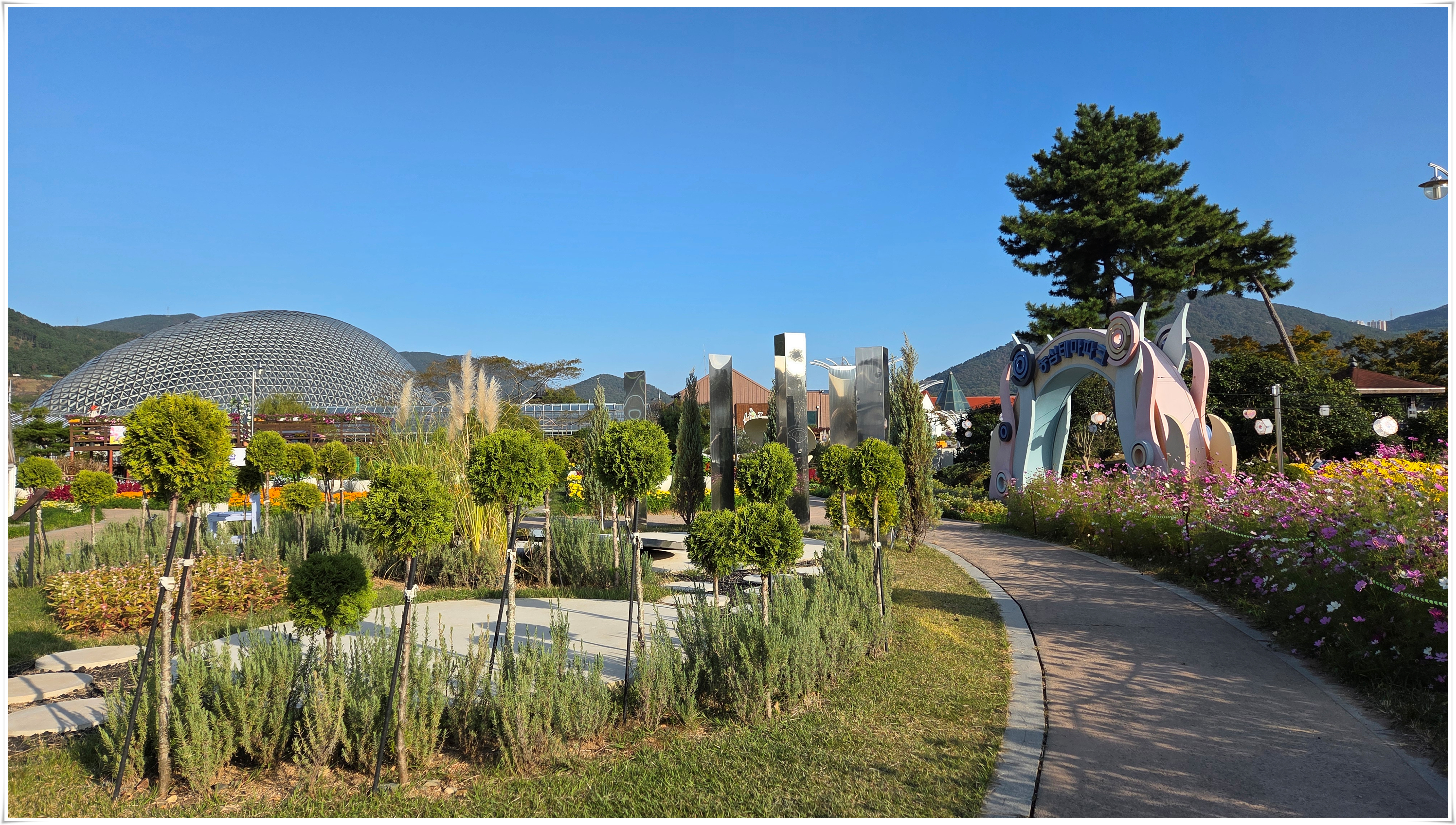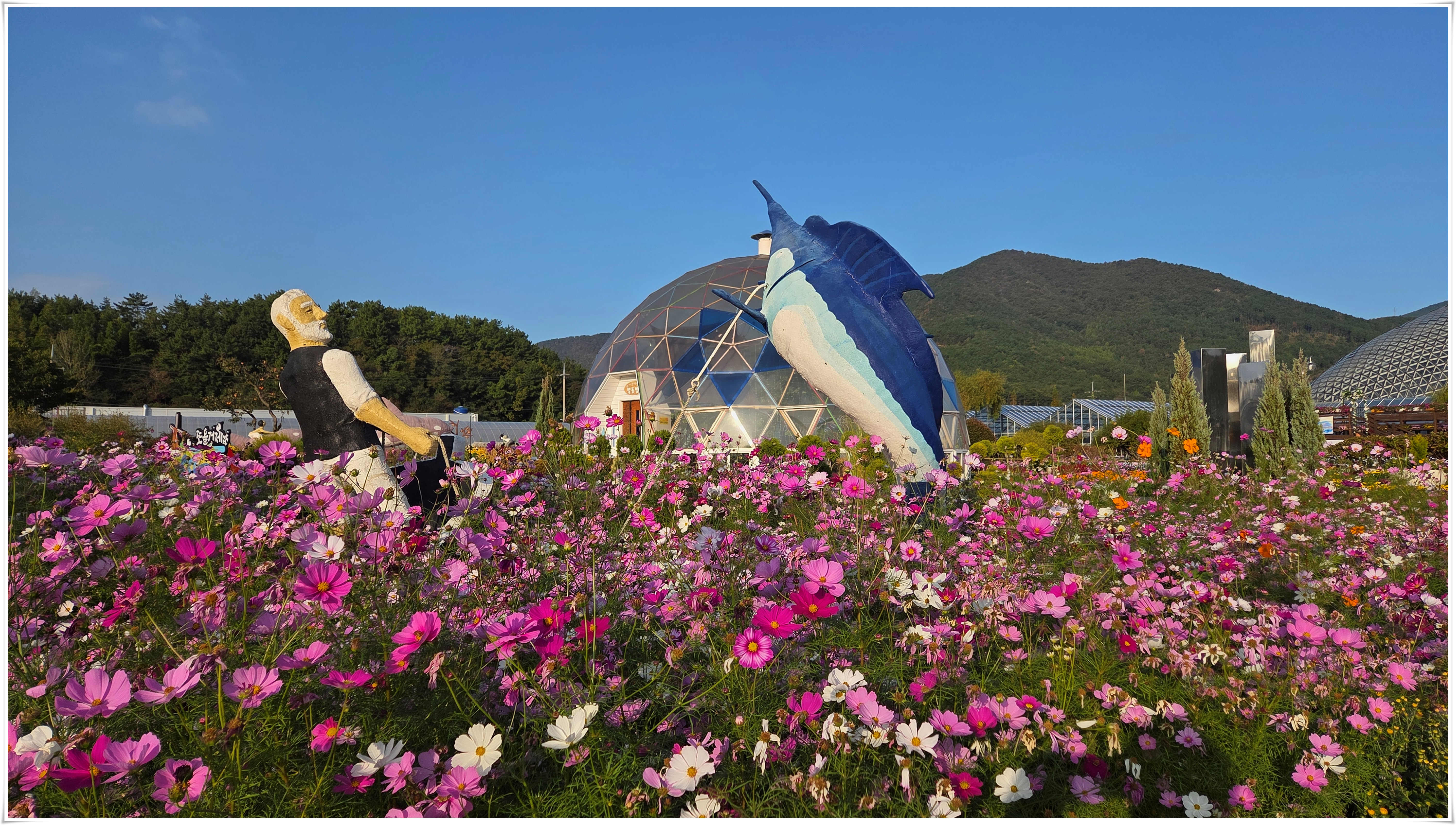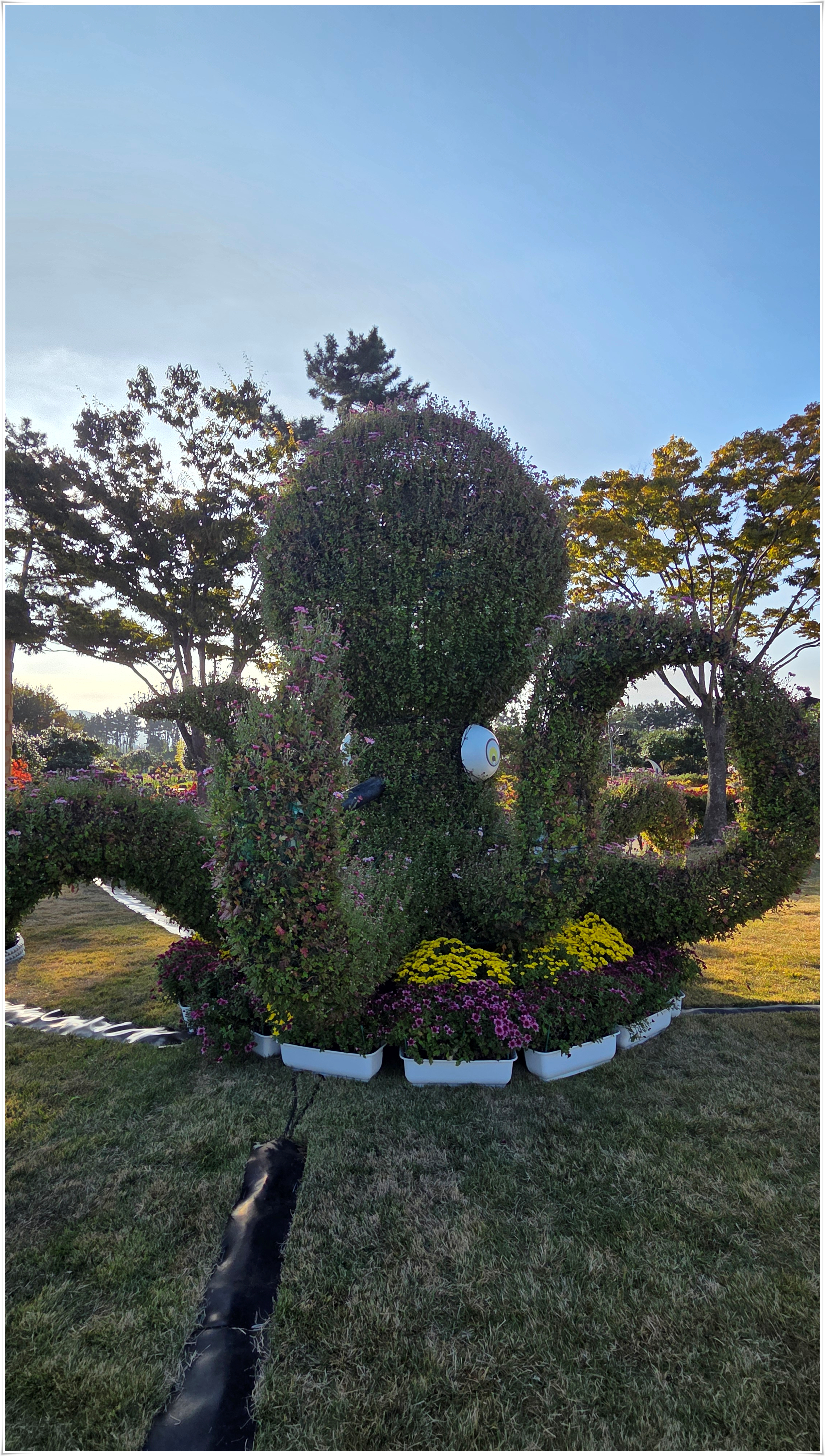 가을꽃 향연 국화와 코스모스 핑크물리등 가을을 물들이는 형형 색색의 꽃들로 축제장을 가득 채우고 있었다. 밤외 되면 조형물 위로 불빛이 내리고 프로젝션 맵핑이 만들어내는 환상적인 야경과 낮과는 전혀 다른 모습을 볼 수 있다고 한다.