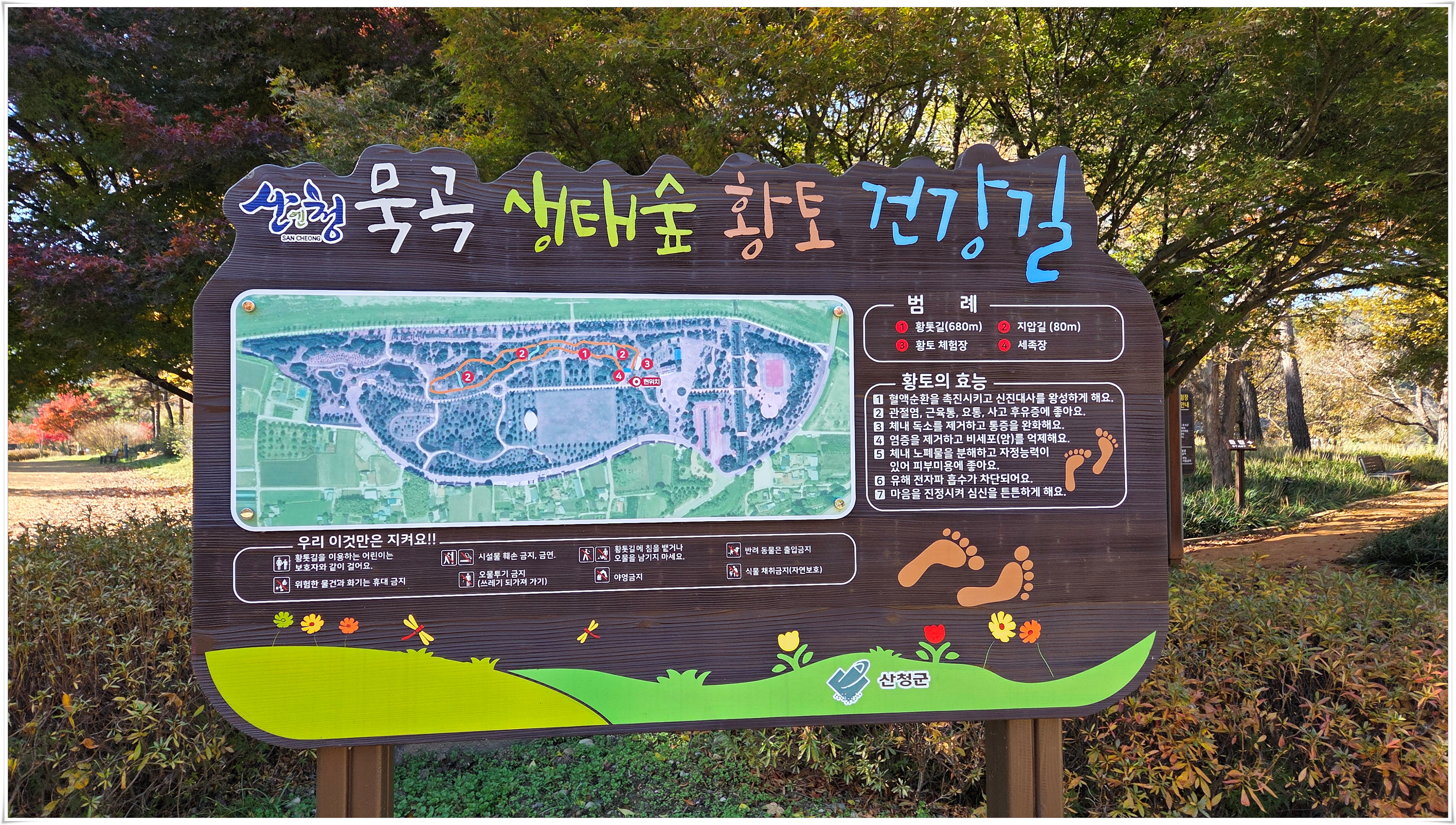 산청 묵곡생태숲 공원 자료를 찾아보니 2007년 묵곡생태근린공원을 조성하기로 하였다고 되어 있다. 산청군 관내 우수식물 자원을 육성해 군민들과 관광객들에게 휴양레크레이션 장소를 제공하려 단성면 묵곡리에 자연친화적 근린생활공원을 만들었다고 합니다. 묵골리 104만2천㎡에 녹지공간을 비롯한 편의시설과 생활체육시설, 자연과 생태숲을 학습할 수 있는 관찰 체험활동 공간등이 만들어져 있다. 2024년에는 맨발로 거닐 수 있는 황톳길이 조성돼 힐링 공간 및 이용객들이 건강증진을 위한 시설을 조성하였다고 합니다.