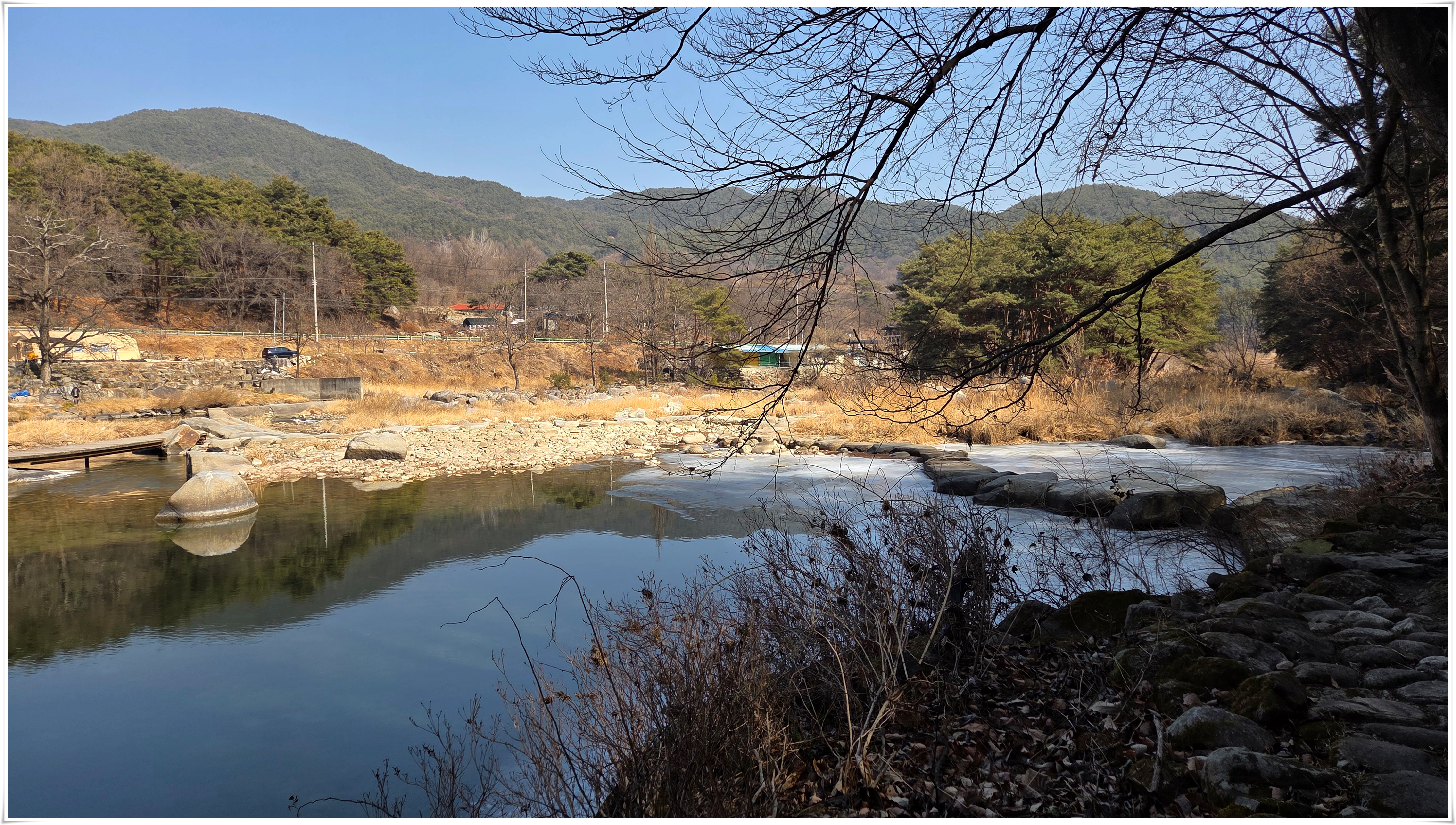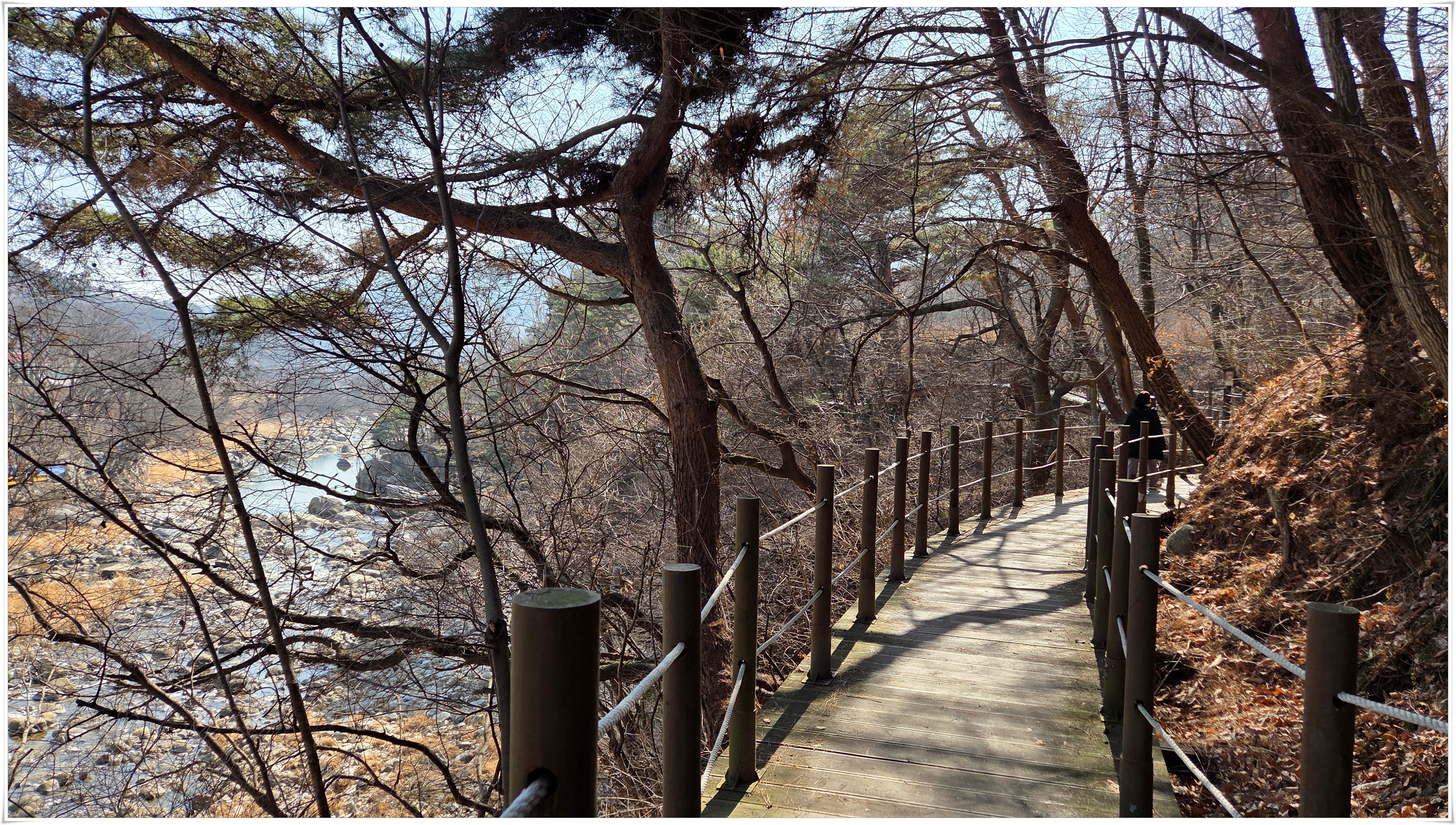 길이 끊기는 지점에선 자연석(自然石)으로 이어진 징검다리를 건넌다. 비가 많이 오는 날엔 중간 부분이 물에 잠겨 신발을 벗고 건너야 하는데 돌이 흔들리므로 조심 조심 걷는다. 징검다리 중간쯤에서 오른쪽 소나무 섬으로 빠져 나무데크 산책로에 오른다.