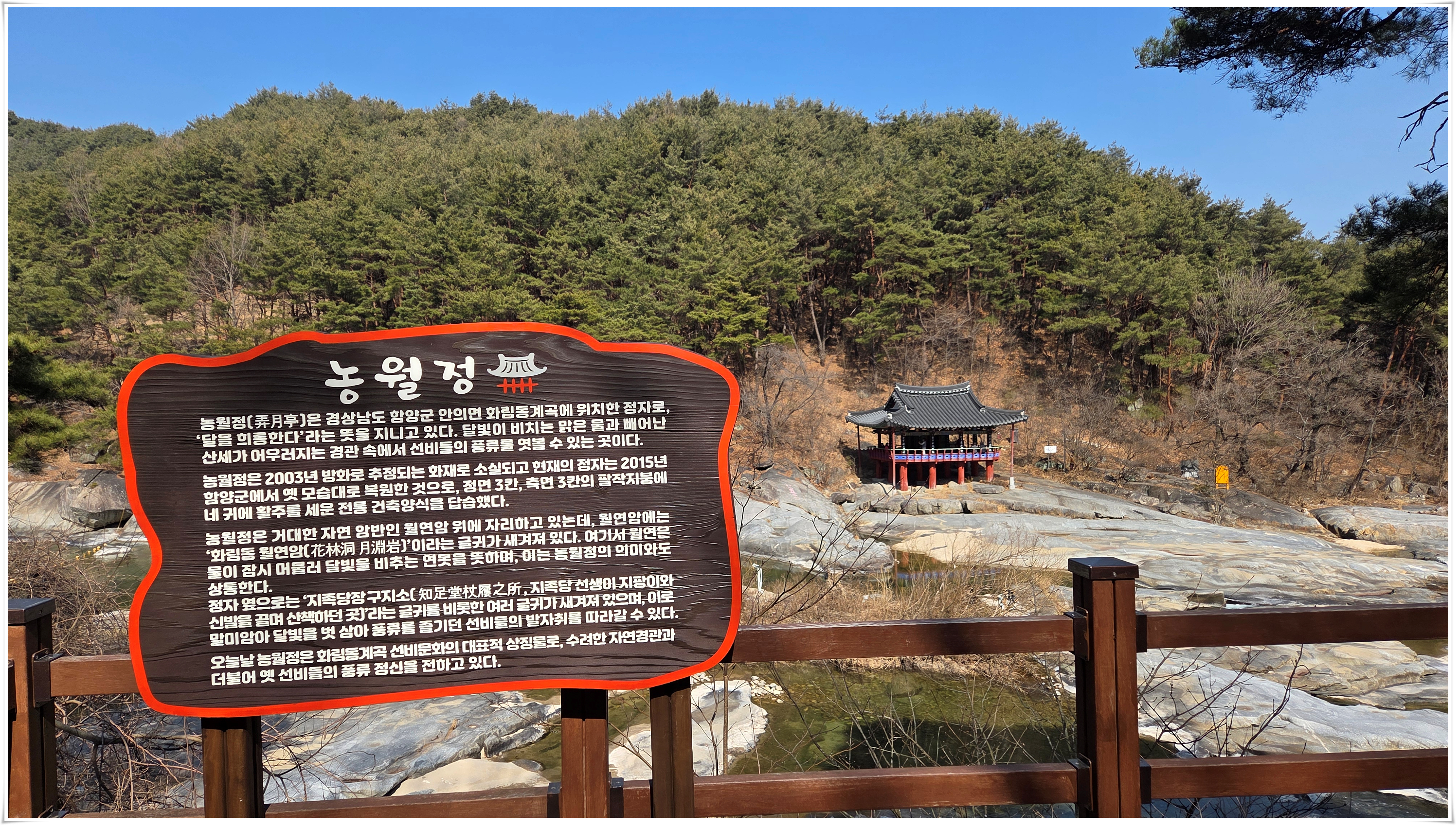 탐방로 마지막 지점인 농월정 터는 여유로이 계곡 풍경 즐기고 싶은 이들에게제격이다. 도로와 멀리 떨어져 있어 한갓지고 조용하다. 정자 이름 “농월(弄月)은 ‘한 잔 술로 달을 희롱한다’는 멋스러운 뜻을 지녔다. 술 한잔 기울이고 싶은 넓은 너럭바위가 계곡과 어우러져 근사한 풍경을 빚어낸다. 농월정은 조선 중기학자 지족당(知足堂)박명부가 광해군 때 영창대군의 죽음과 인목대비의 유배에 대한 부당함을 지목하다 고향 함양으로 유배 왔을 때 지은 정자로 지난해 화재로 쓰러져 복원 중이다. 바로 앞 바위에 새겨진 ‘지족당장구지소(知足堂杖屨之所)’란 글자는 ‘지족당 선생이 지팡이 짚고 놀던 곳’이란 뜻이다.